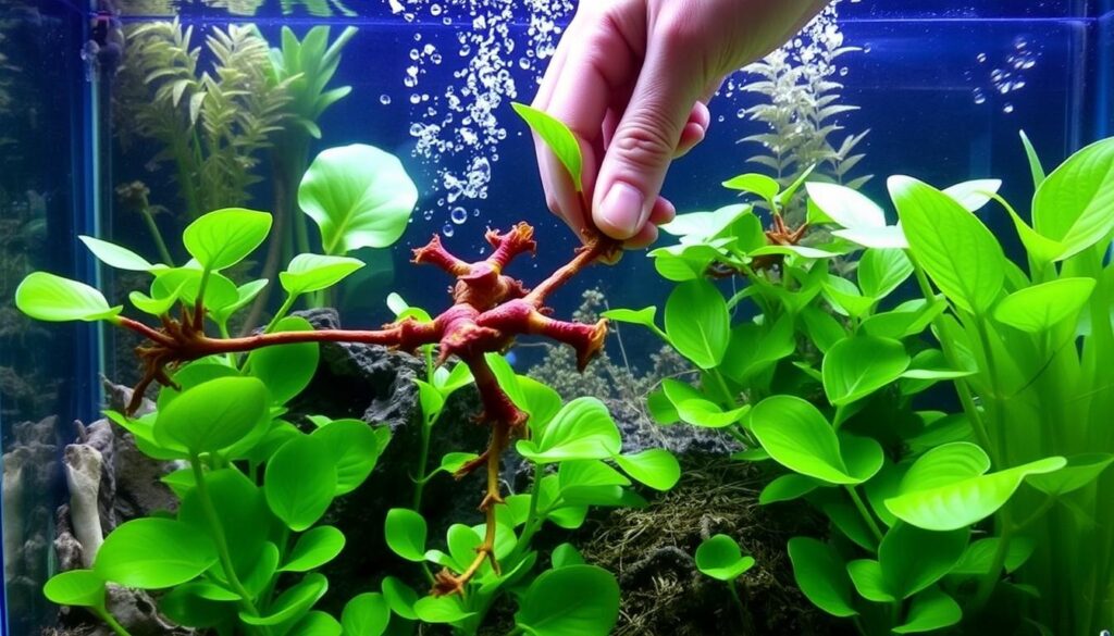 Die erfolgreiche Anubias Vermehrung und Pflanzung in Aquarien beginnt oftmals bei der Rhizomteilung, einer bewährten Methode zur Vermehrung dieser robusten Pflanzen. Das Wissen um die richtigen Pflanztipps kann deutlich zur Gesundheit und zum Wachstum Ihrer Anubias beitragen.